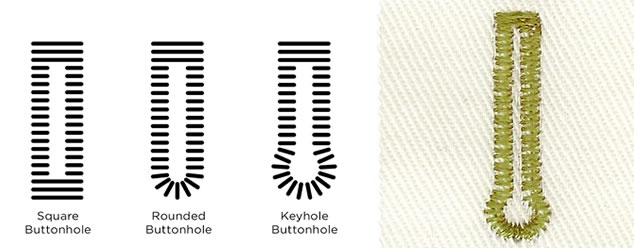 This keyhole buttonhole has a bar tack at one end and a round opening at the other edge.