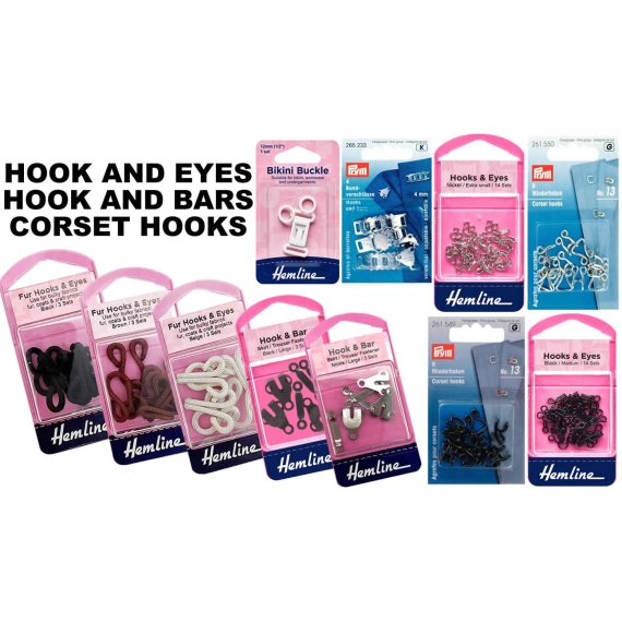 Hook and bar clasps - Assorted range of types and sizes for for joining 2 pieces of fabric together.