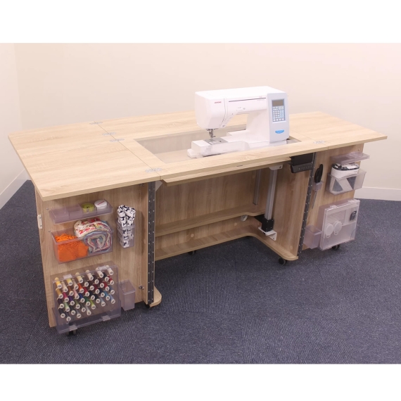Small is size, but it has the super-maxi inset aperture, and hence has the ability to accommodate larger sizer sewing machines. Measuring in at less than 1 meter wide, it is a compact unit. It offers plenty of storage compartments and the advantage of pressing a button to lift or lower your sewing machine, no matter how heavy it is.