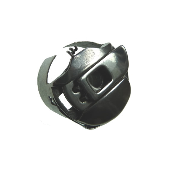 This spool case fits many industrial sewing machines made by Brother, Singer and selected Riccar domestic sewing machines. Note the pig-tail thread guide attached to the bobbin case.