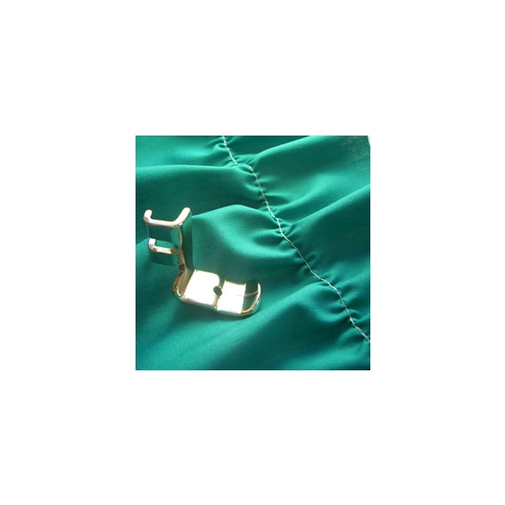 Use this foot for creating soft gathers in lightweight fabrics. The underside of the foot is raised behind the needle and has a thick bar in front of the needle to gather and attach a ruffle onto a flat piece of fabric simultaneously. Use a ruffler to obtain a more dramatic gather. Suitable for most Singer, Brother, Jones, Newhome, Janome, Elna, Toyota, Riccar