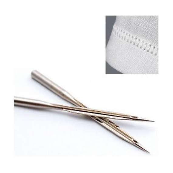 Also known as a "wing" needle because of its special design. The wings push fabric threads aside producing the characteristic holes of hemstitched fabrics. Suitable light or medium weight loosely woven delicate, crisp, natural fabrics. Popular for heirloom sewing and to create decorative cutwork.